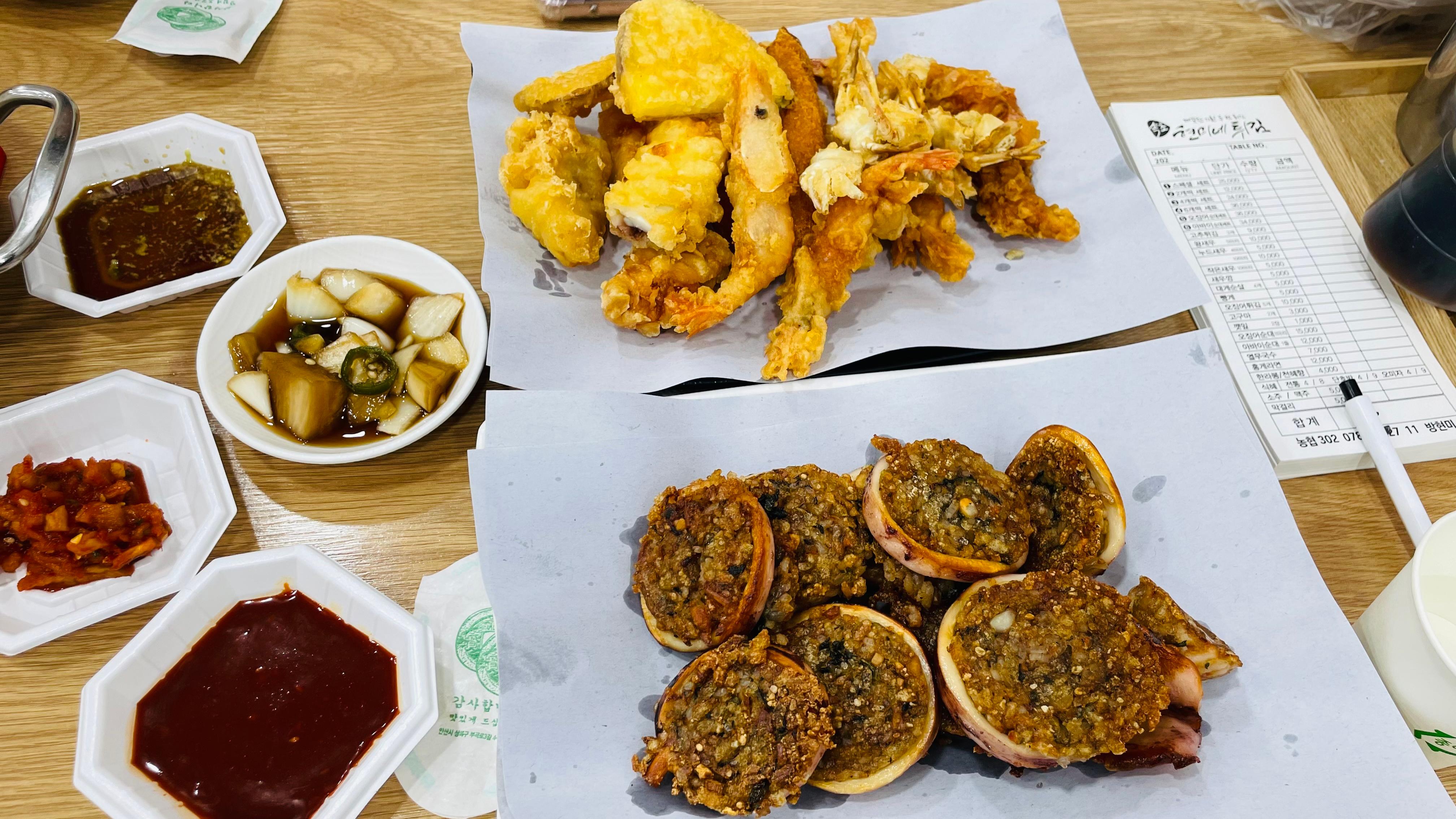 사실은 오징어순대를 먹으러 갔었는데, 다른 가게들은 줄이 너무 길더라고요... 저번에 한 번 맛본 기억은 있었지만 긴 줄을 감당하기 힘들어서 다른 곳을 찾아보기로 했습니다. 다행히 웨이팅이 없어서 바로 들어갈 수 있었는데요. 튀김과 오징어순대는 속초 시장에서 흔히 볼 수 있어 큰 기대 없이 들어갔는데, 첫 입 먹자마자 “맛있다” 싶었어요
