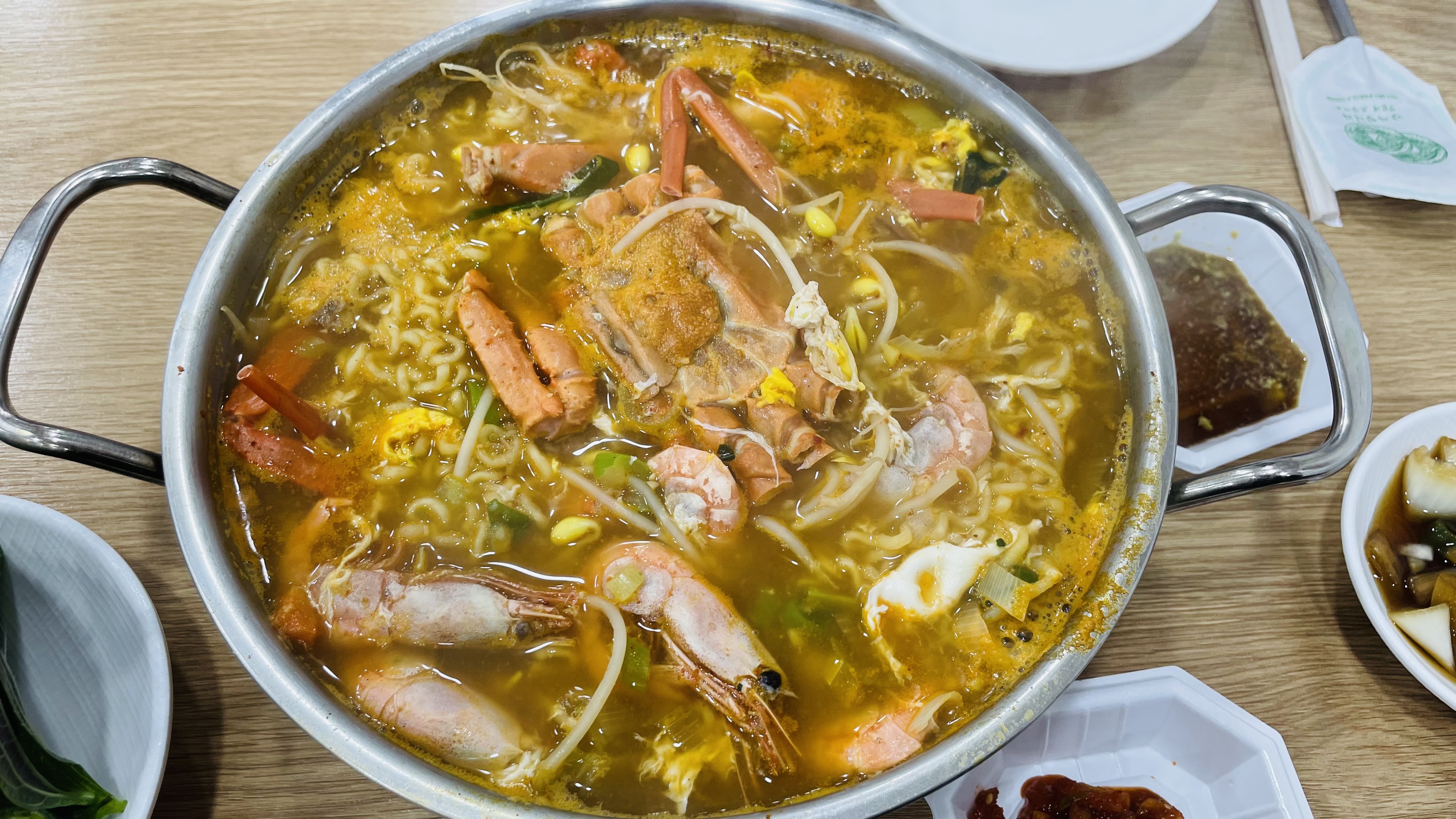 약간 삼삼한 맛이라 자극적이지 않고 시원한 국물이 매력이에요. 개인적으로 좀 짜게 먹는 편이라 간은 좀 아쉬웠는데 라면 주문 전에 좀 더 짭짤하게 해달라고 하면 맞춰주실 것 같아요. 일단 게 자체는 국물용이라 살이 있지는 않았지만, 새우는 통통하고 맛있었습니다. 시원한 콩나물과 해물 조합이라 한 번 정도는 먹어보시는 걸 추천드립니다.