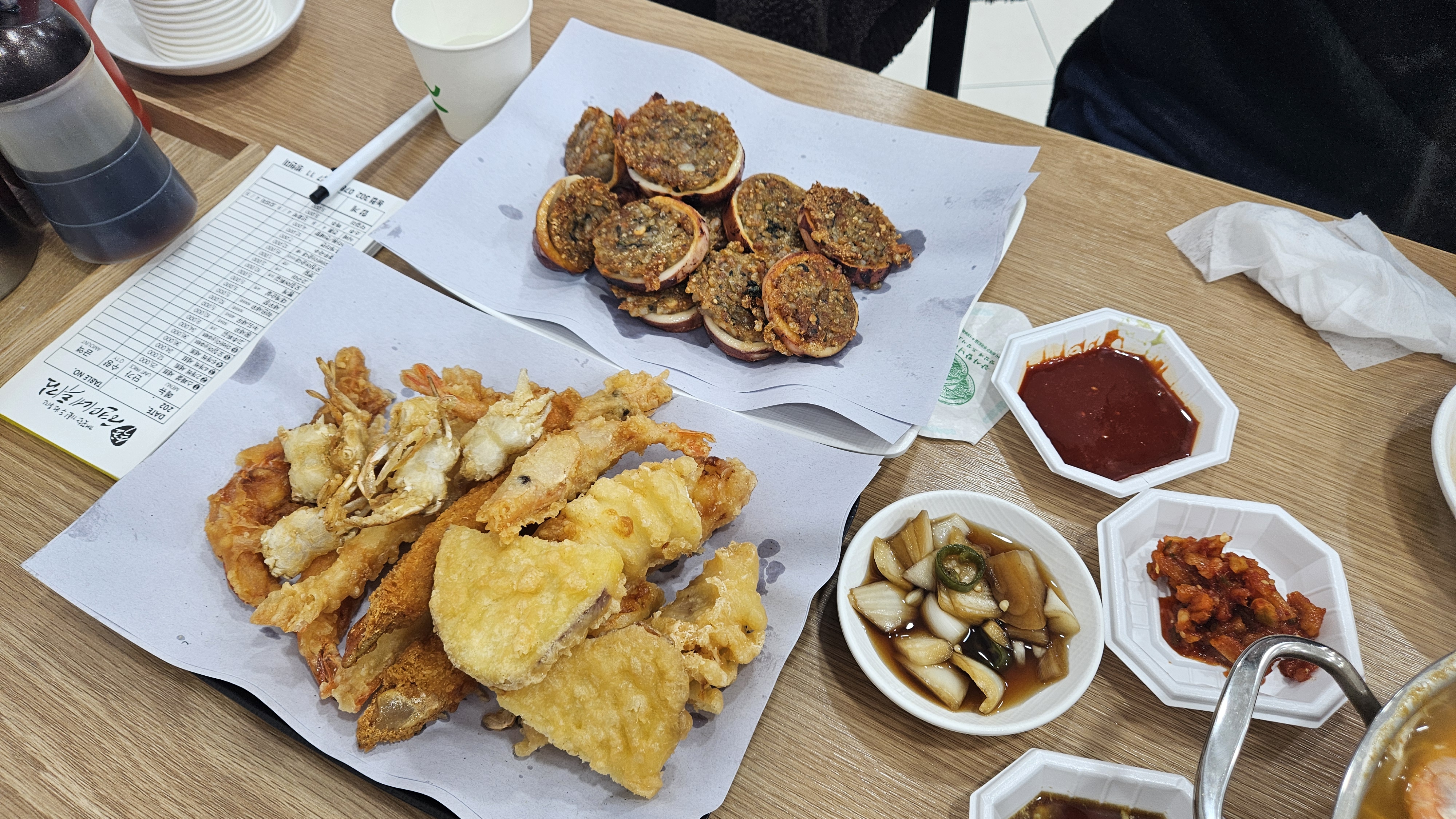 저희는 누룽지 오징어순대와, 모둠 튀김, 그리고 느끼함을 없애 줄 라면을 함께 시켰어요.