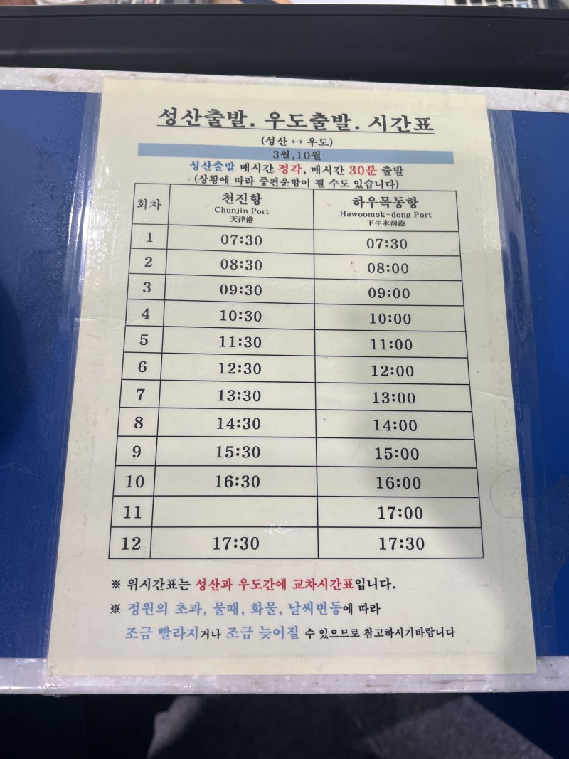 배 시간은 위 사진을 참고하시면 좋고, 더 자세히 알고 싶으시다면 공식 홈페이지나 고객센터를 통해 확인하실 수 있습니다. 저희는 10시쯤 배를 타고 우도로 들어갔어요.