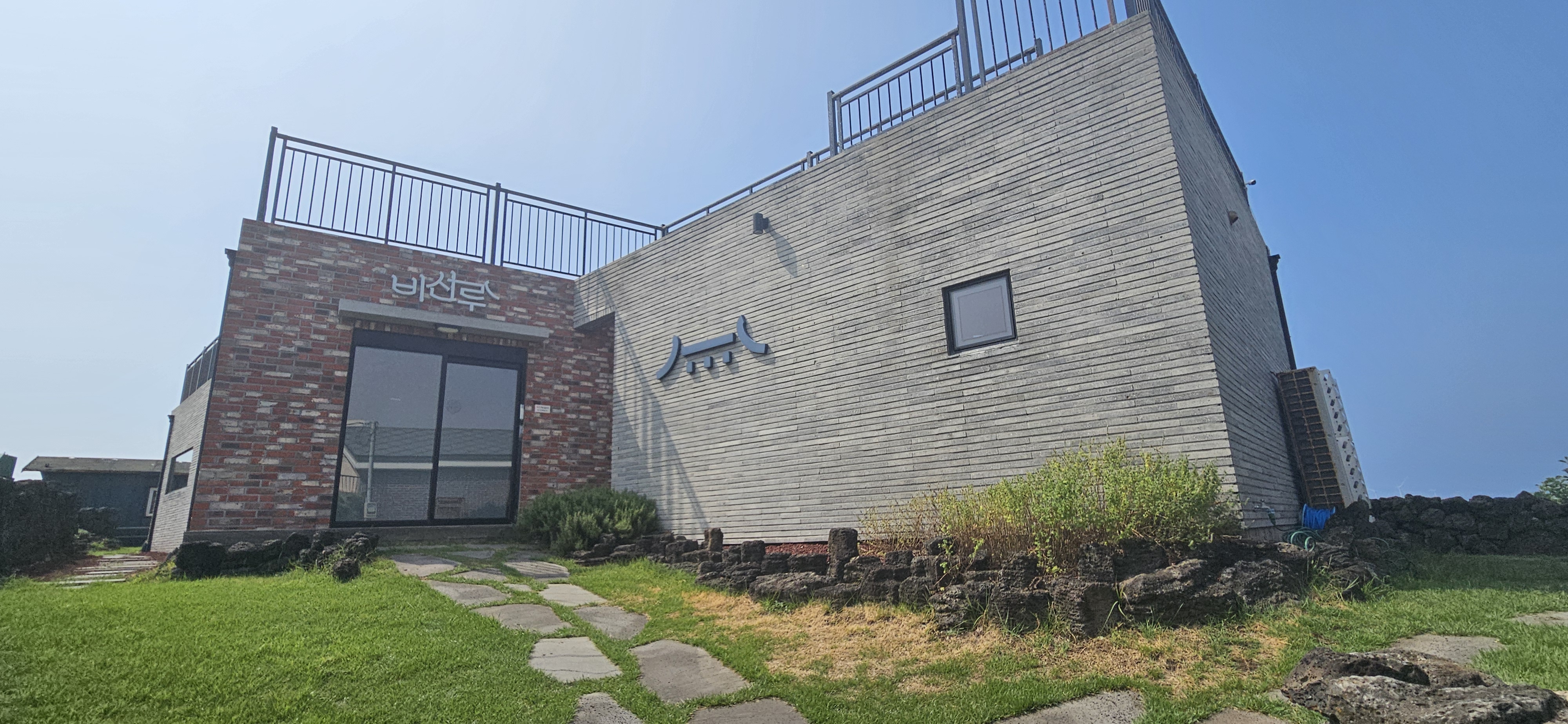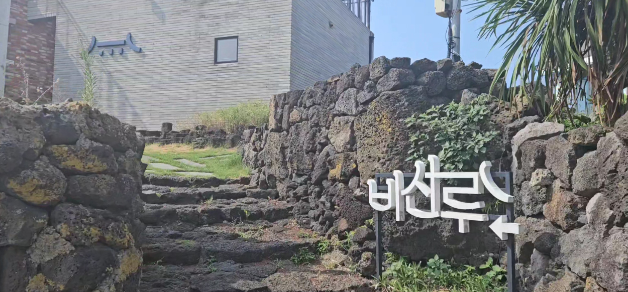 비선루는 제주 돌담과 잔디, 기와 문양이 어우러지는 단정한 분위기. 입구부터 기분이 좋아지는 카페였습니다.
