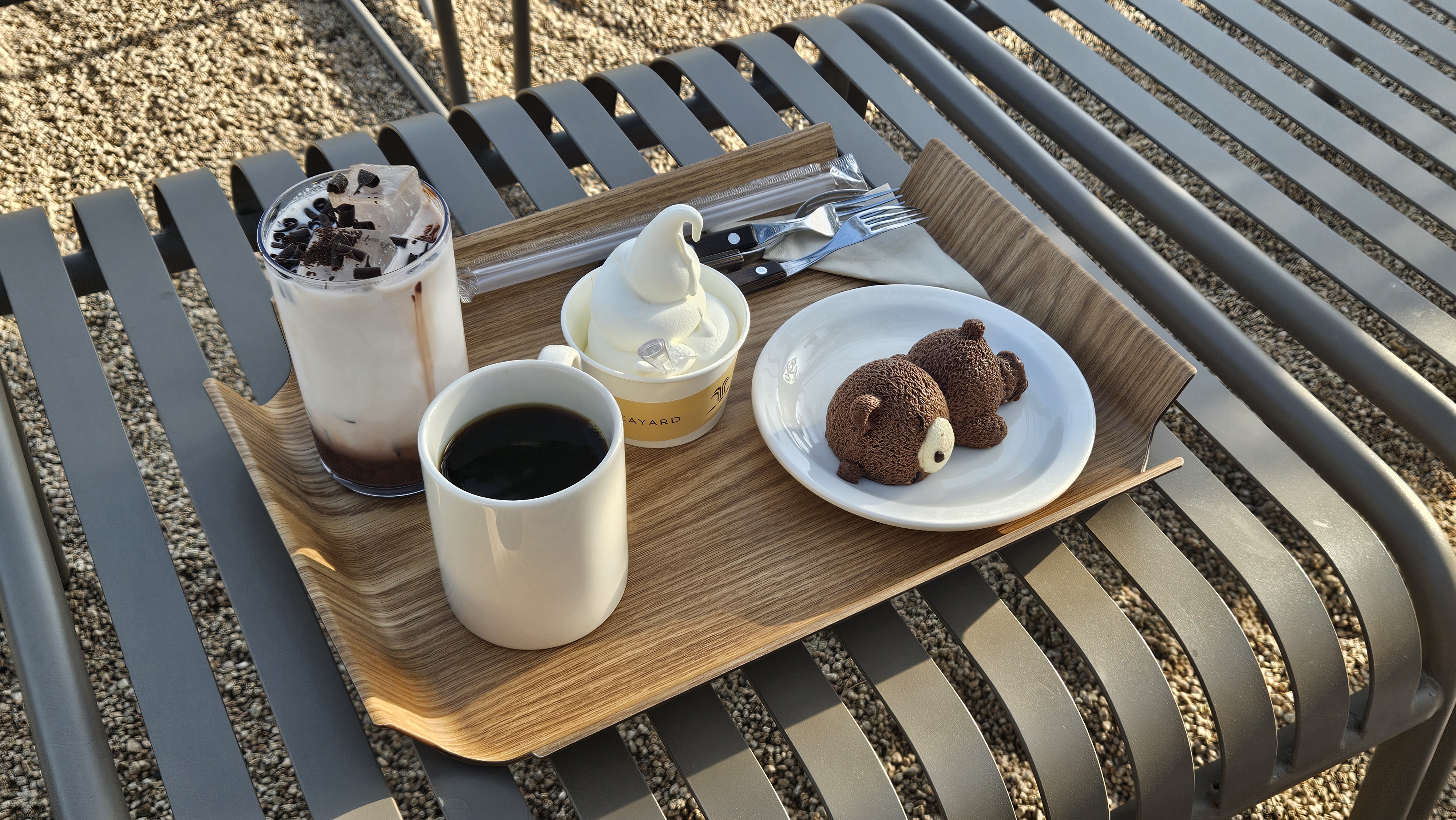 다양한 베이커리와 음료가 있는데, 그중에서도 특히 '씨야드 라테'라는 메뉴가 있는데, 푸른 바다와 하늘을 연상시키는 크림이 올라간 라테가 시그니처 메뉴라고 합니다. 저는 여기서 아이스크림과 아메리카노를 마셨는데 커피는 무난했고 케이크, 아이스크림이 예상외로 진하고 맛있었습니다.
