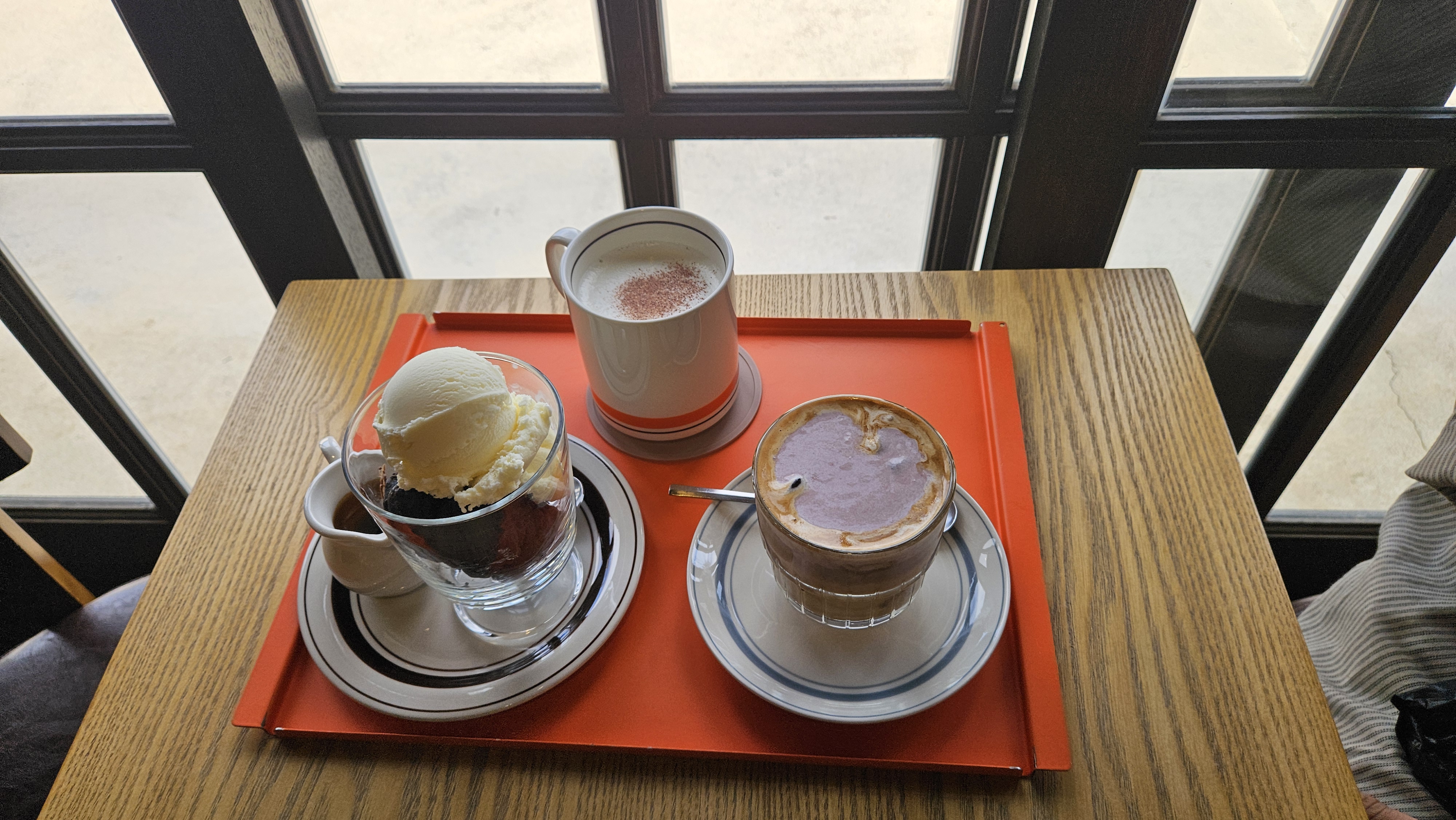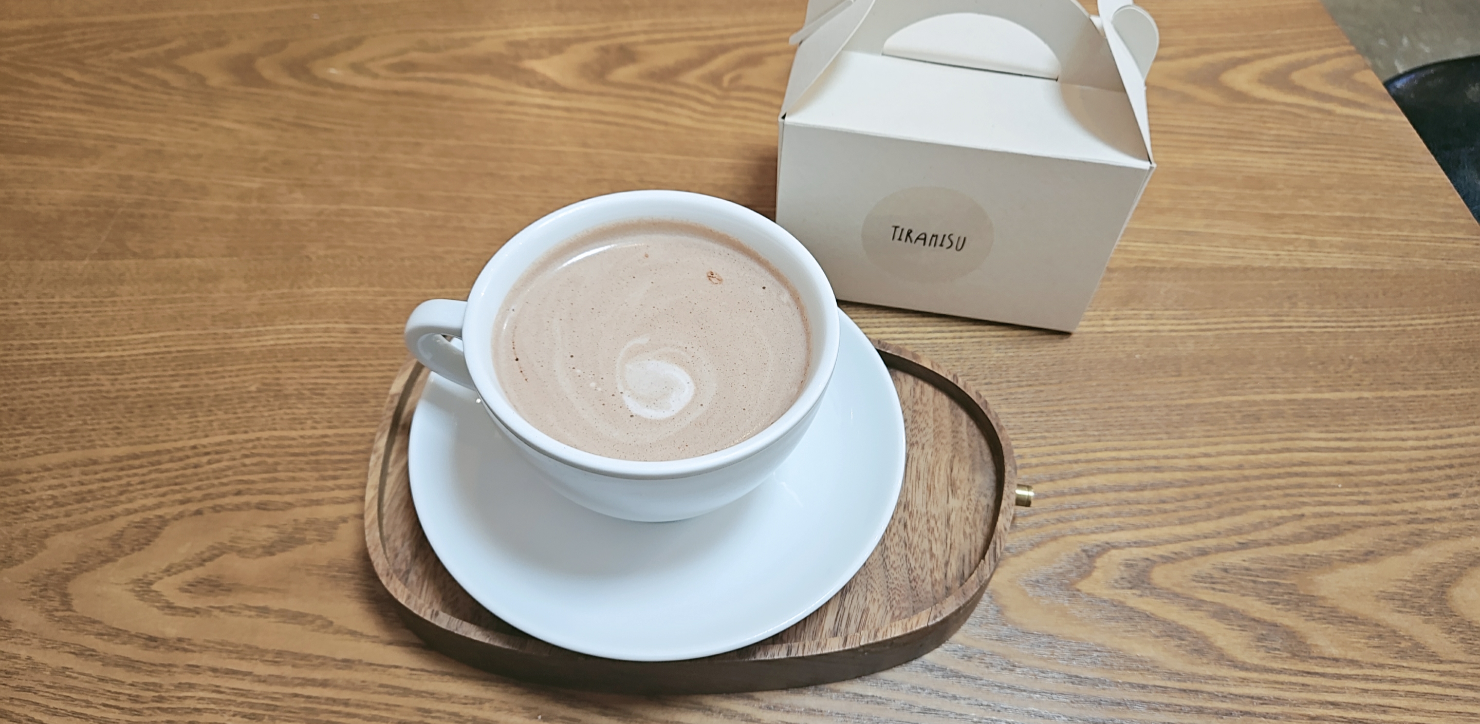 제가 시킨 달콤한 핫초코와 다른 곳에서 포장해 온 티라미수 한 컷. 핫초코는 예상대로 고소하고 달콤한 맛이 좋았습니다.