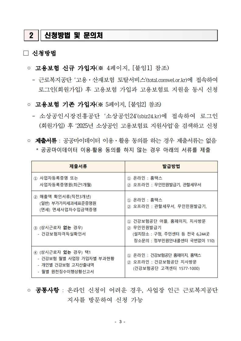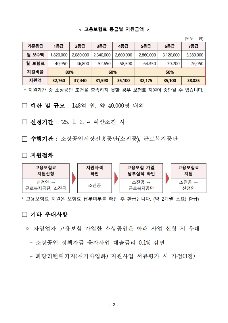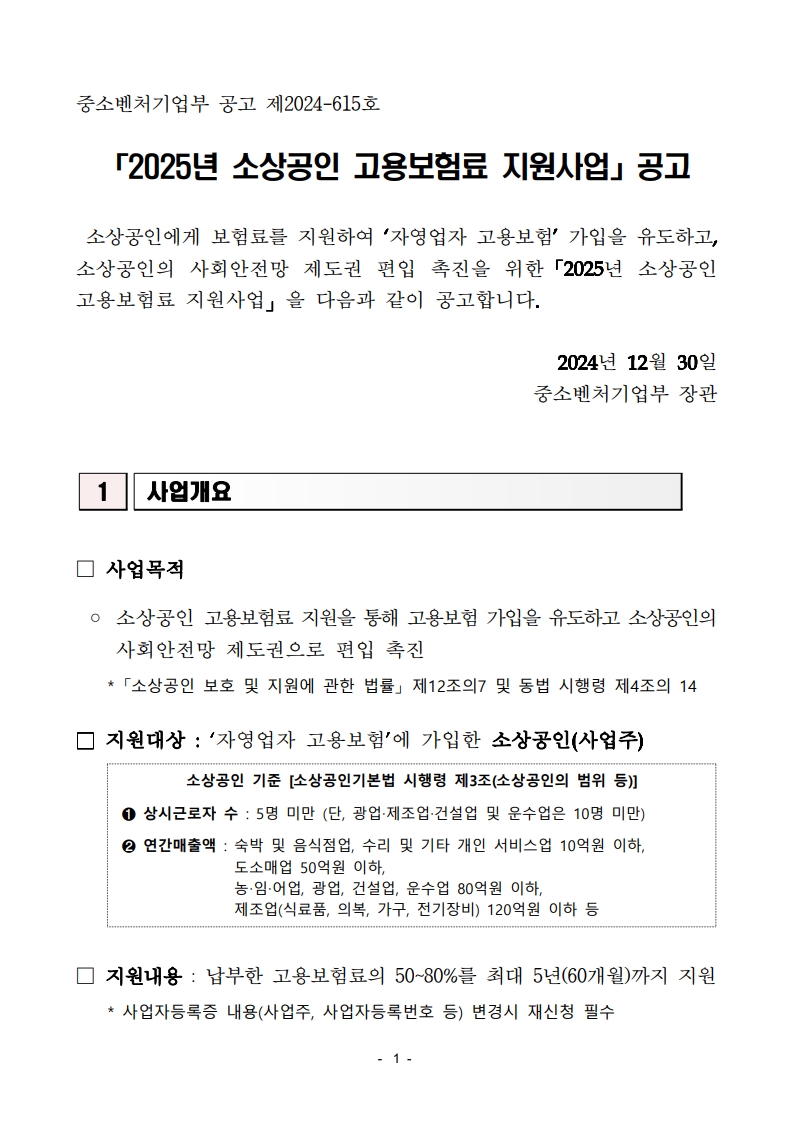 2025년 소상공인 고용보험료 지원사업은 자영업자의 고용보험 가입을 장려하기 위해 정부가 보험료 일부를 지원하는 정책입니다. 신청기간은 25년 01월 02일부터 예산 소진 시까지니 아직 신청 안 하신 분들은 아래 요약 내용과 공고문 내용 참고하셔서 빠르게 신청해 보세요^^